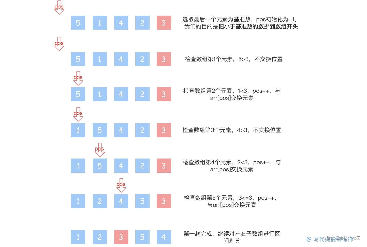 我们定义一个pos指针, 标识等待置换的元素的位置, 然后逐一遍历数组元素, 遇到比基准数小的就和arr[pos]交换位置, 然后pos++